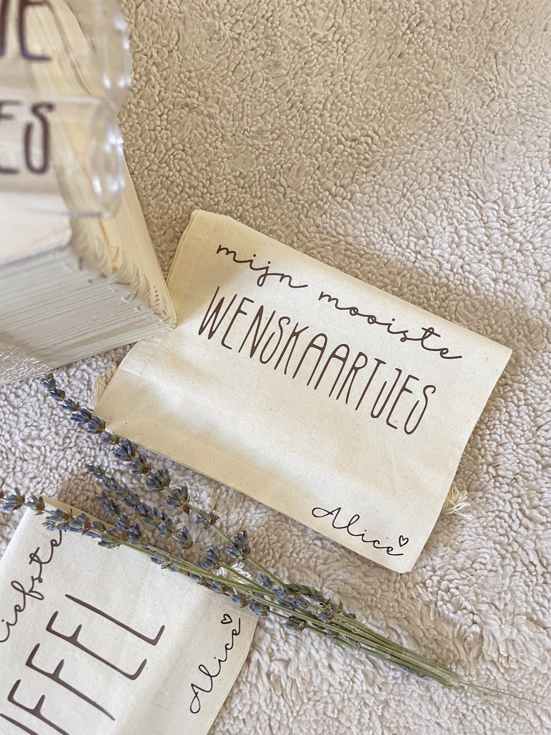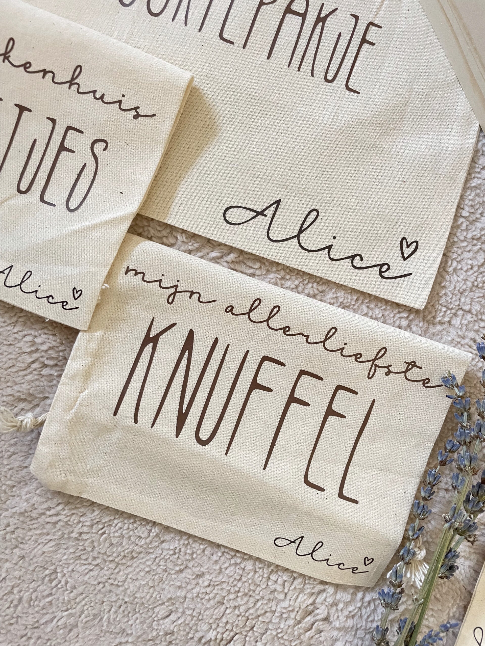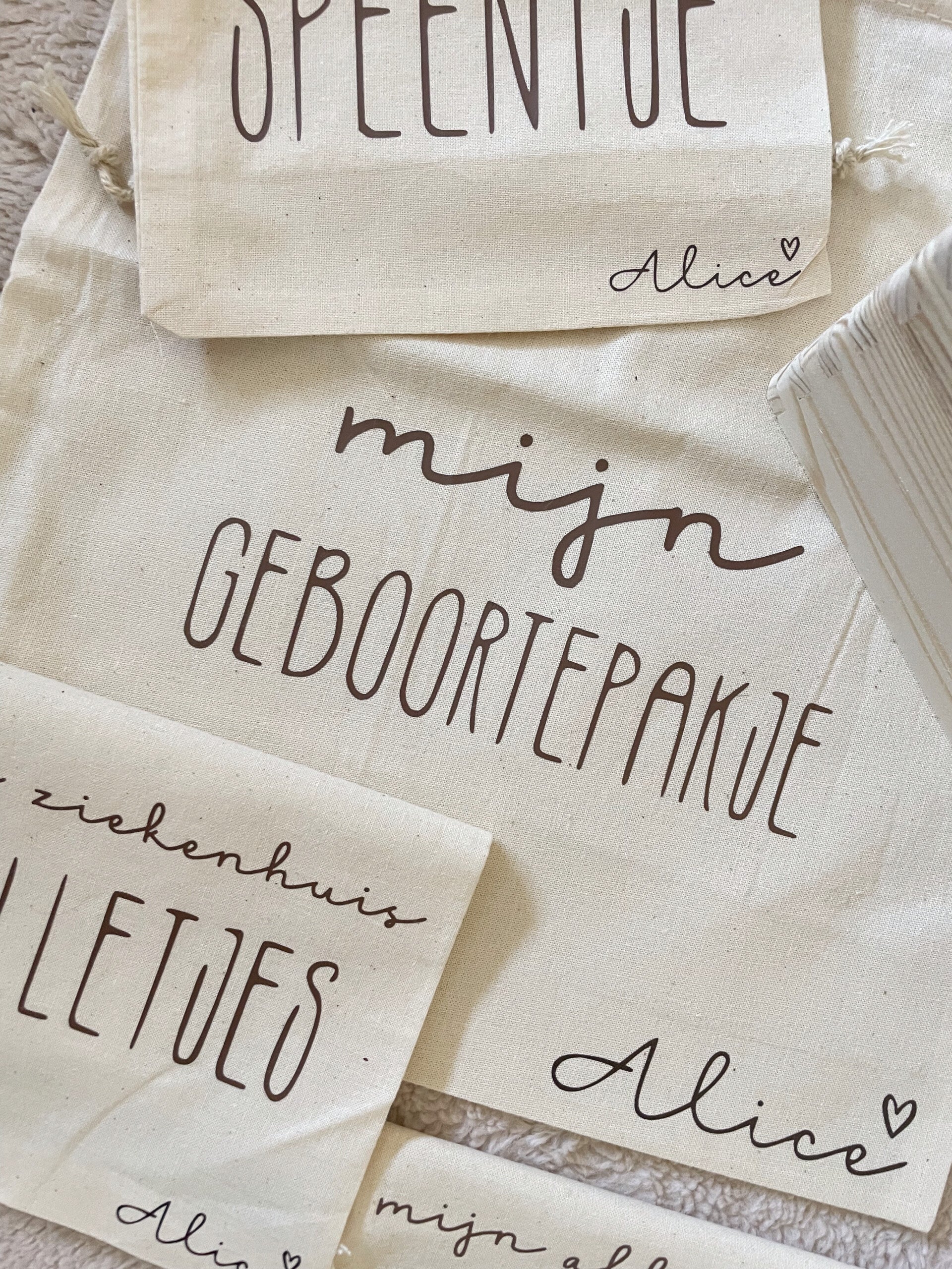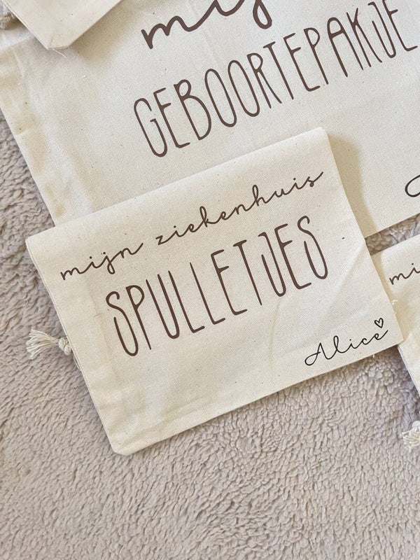 👶 4 Kleine zakjes om speciale items in te bewaren: mijn eerste speentje en mijn favoriete wenskaartjes, mijn allerliefste knuffel en mijn ziekenhuisspulletjes. (14x20cm)