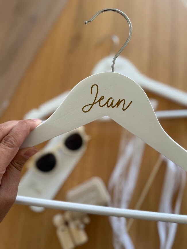 Maak jullie trouwdag nóg persoonlijker met deze elegante witte kapstokken, bedrukt met jullie namen. Perfect om de trouwjurk en het kostuum op te hangen tijdens de voorbereidingen en een prachtig detail op foto’s van de grote dag.